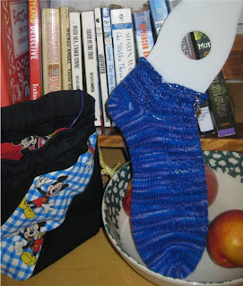 These are a compilation of a couple of patterns. The construction comes from Cat Bordhi's Houdini Socks. The stitch pattern is from Joansie's standby, Blueberry Waffle Socks. The yarn is hand dyed. I wondered what would happen if one dyed half a hank one color and half another. Not much. It's okay, and might be a big more exciting if the colors weren't so closely related..... They are still pretty, just nothing to write home to mom about.